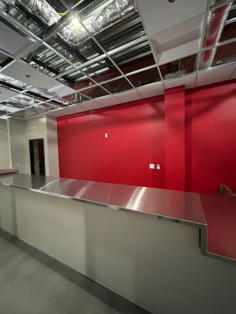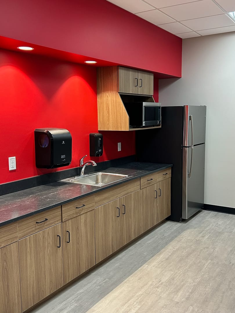 Painting punch list items are nearing completion, and owner furniture and coffee makers have been installed as the space transitions toward occupancy.
